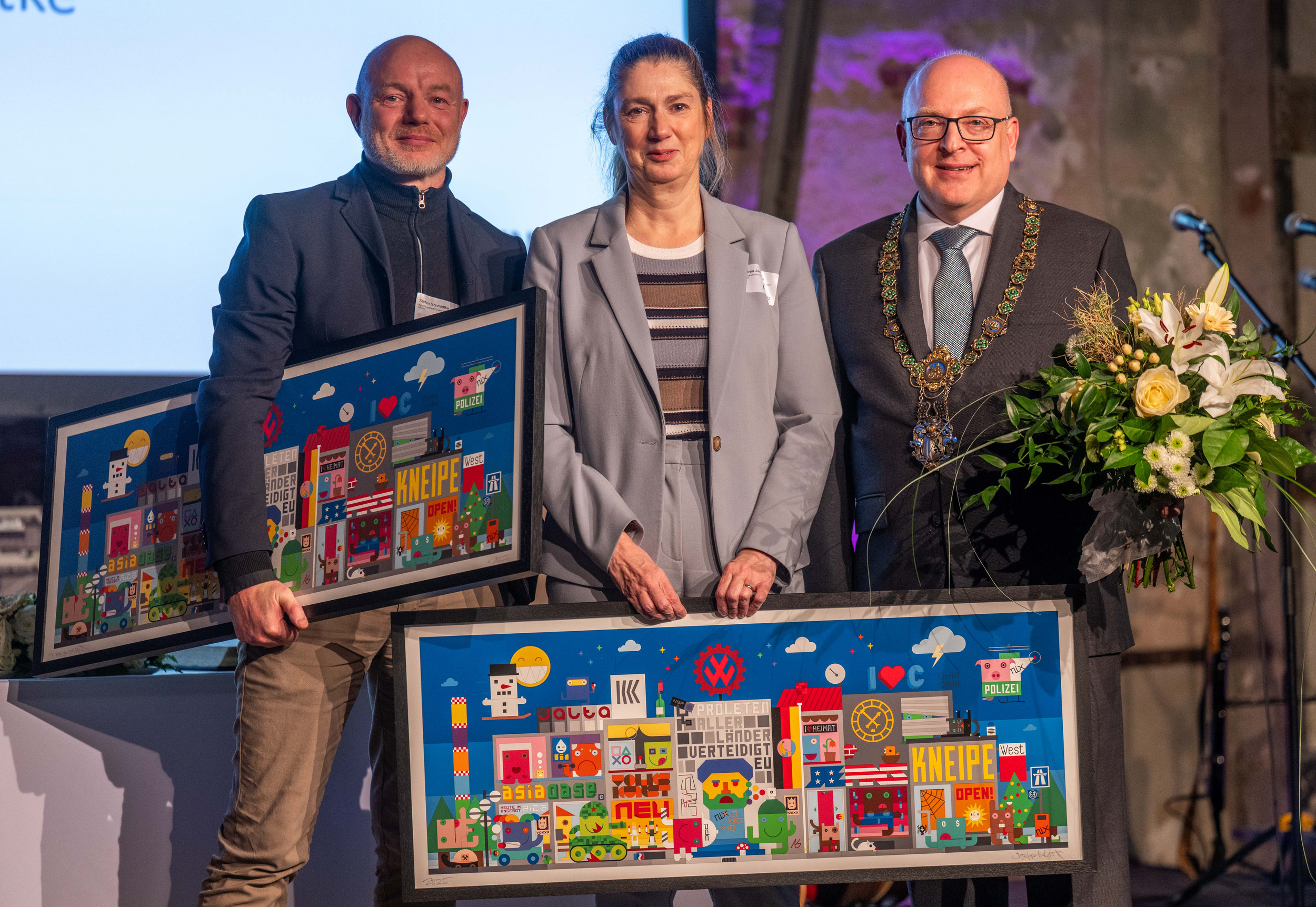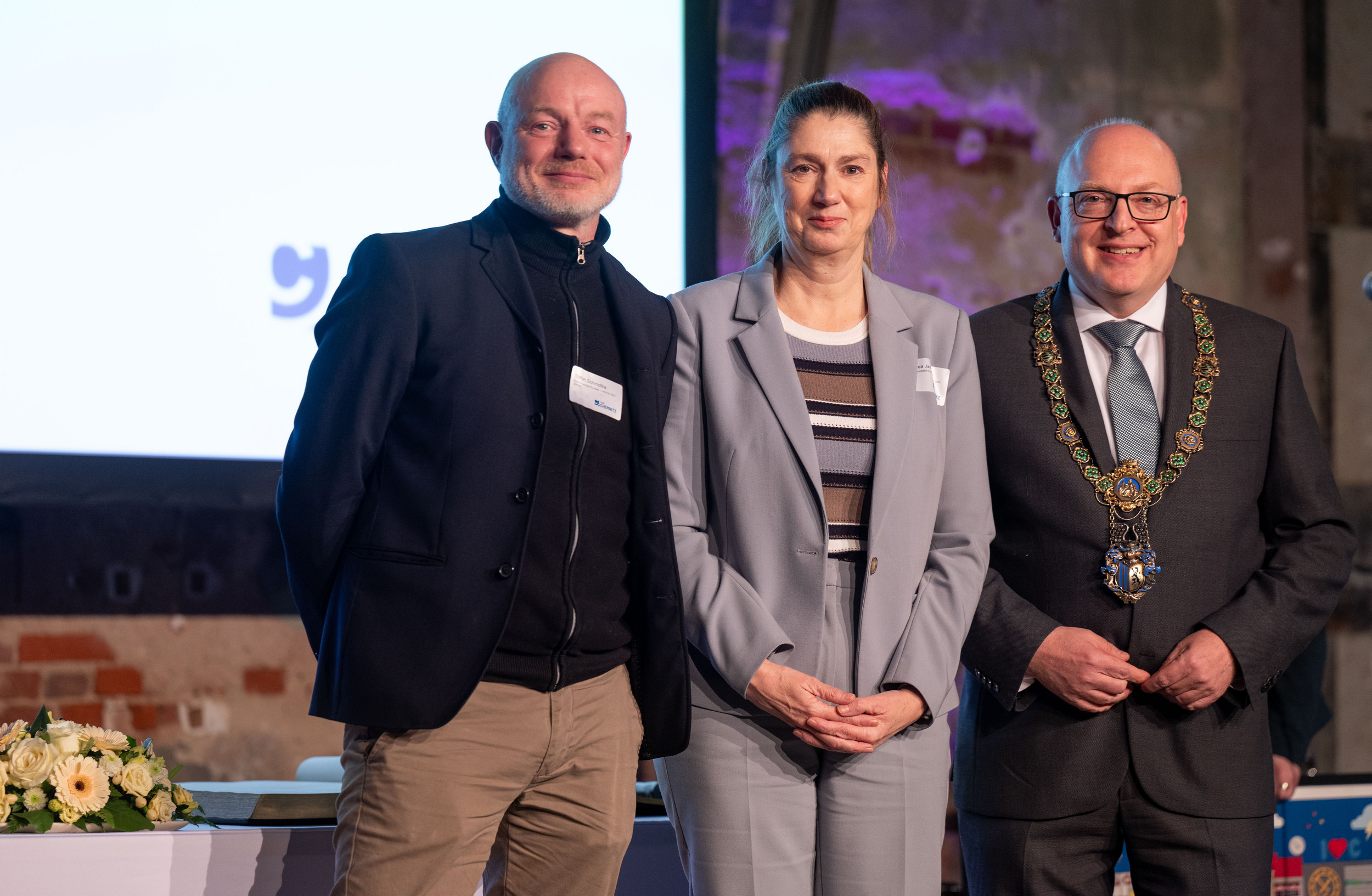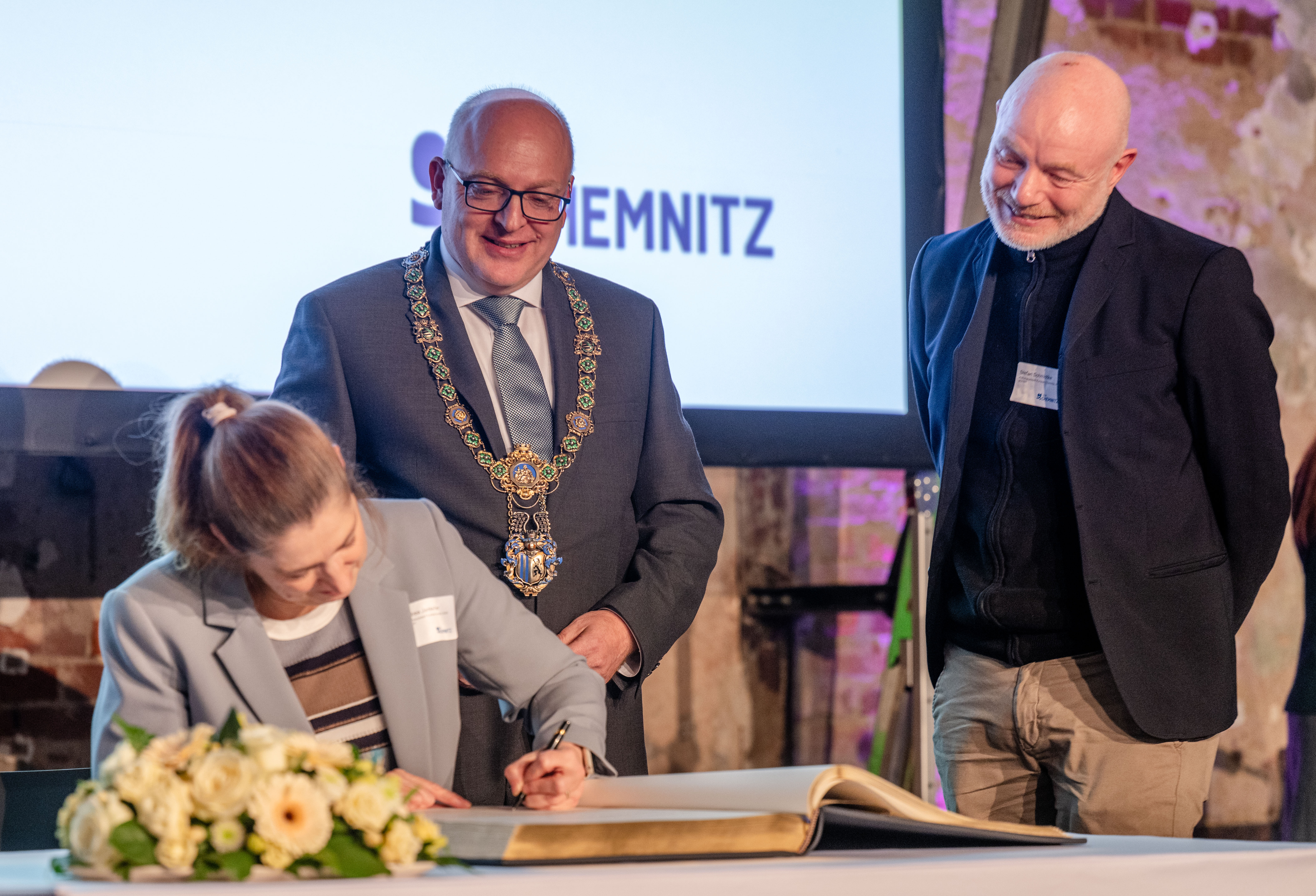 Die Geschäftsführenden der Chemnitz 2025 gGmbH, Andrea Pier und Stefan Schmidtke, haben sich beim Neujahrsempfang des Oberbürgermeisters am 13. Januar 2026 ins Goldene Buch der Stadt Chemnitz eingetragen. Die Stadt würdigt damit ihre vielfältigen Verdienste um die souveräne Durchführung des Kulturhauptstadtjahres. Mit schätzungsweise mehr als zwei Millionen Besucher:innen, Teilnehmer:innen und Gästen – vollen Häusern, internationaler Aufmerksamkeit, einer weltoffenen Atmosphäre und überaus positivem Feedback war Chemnitz 2025 ein großer Erfolg für die Stadt. Andrea Pier und Stefan Schmidtke begleiten in diesem Jahr die Umwandlung der Chemnitz 2025 gGmbH in eine Gesellschaft mit dem Schwerpunkt auf die Legacy – das Erbe – und die langfristigen Wirkungen der Kulturhauptstadt in Chemnitz. Zudem verantworten sie gemeinsam mit dem Theater Chemnitz das Internationale Festival „Theater der Welt“, das vom 18.Juni bis zum 5.Juli 2026 in Chemnitz stattfinden wird.