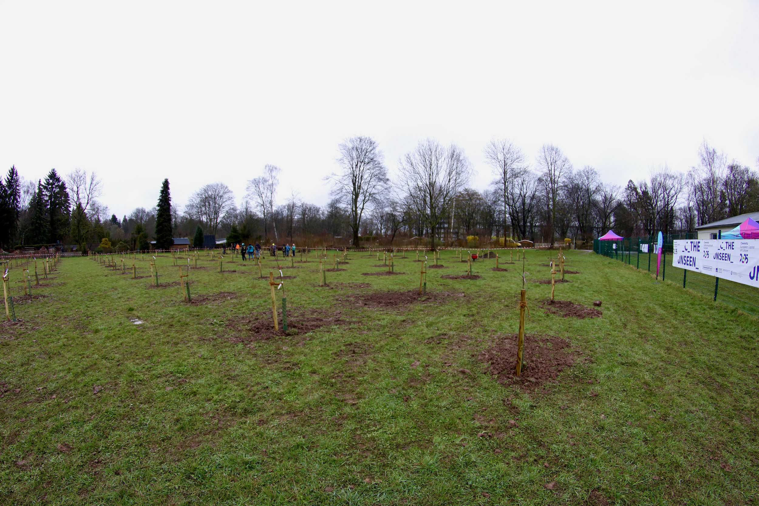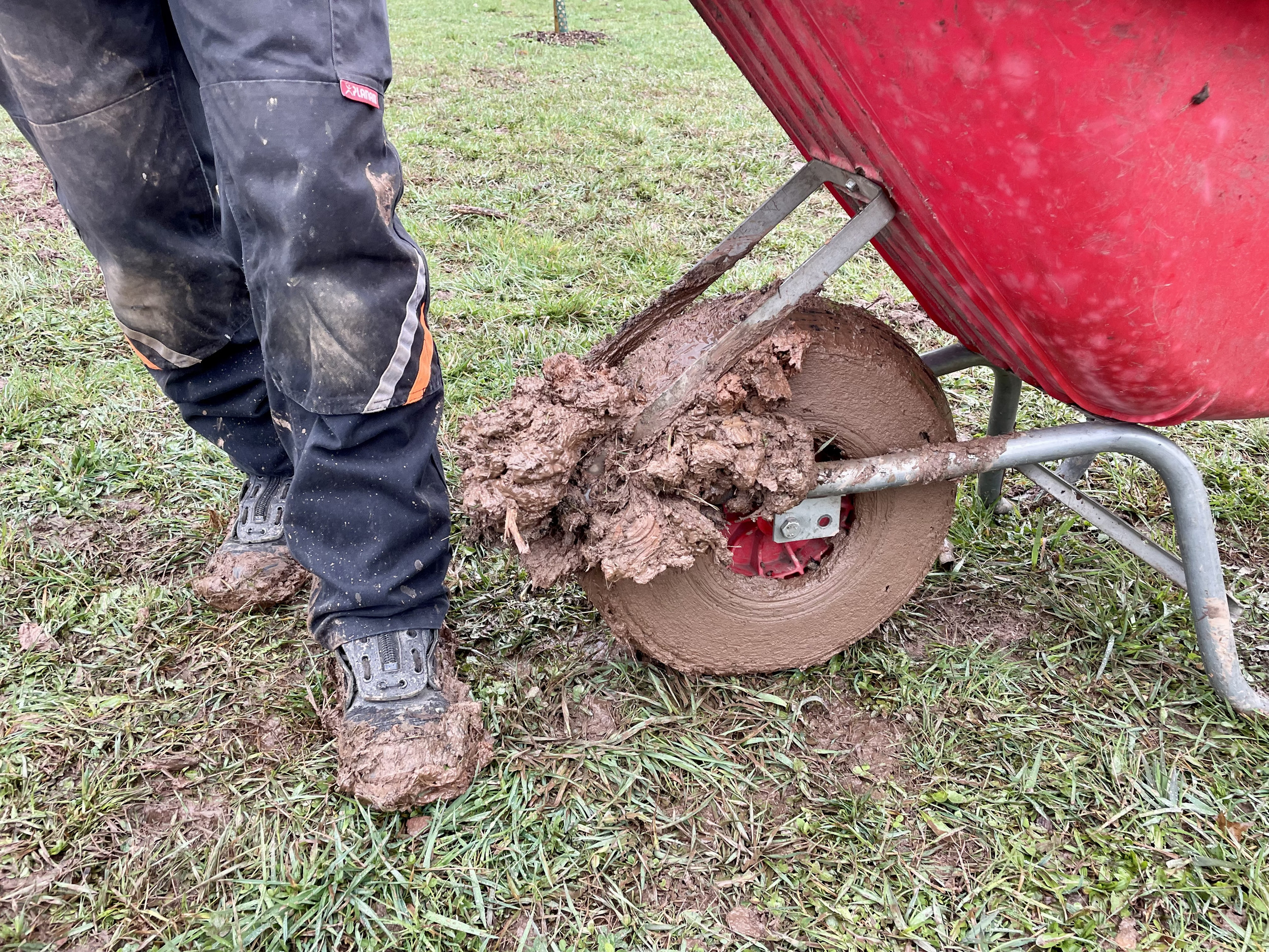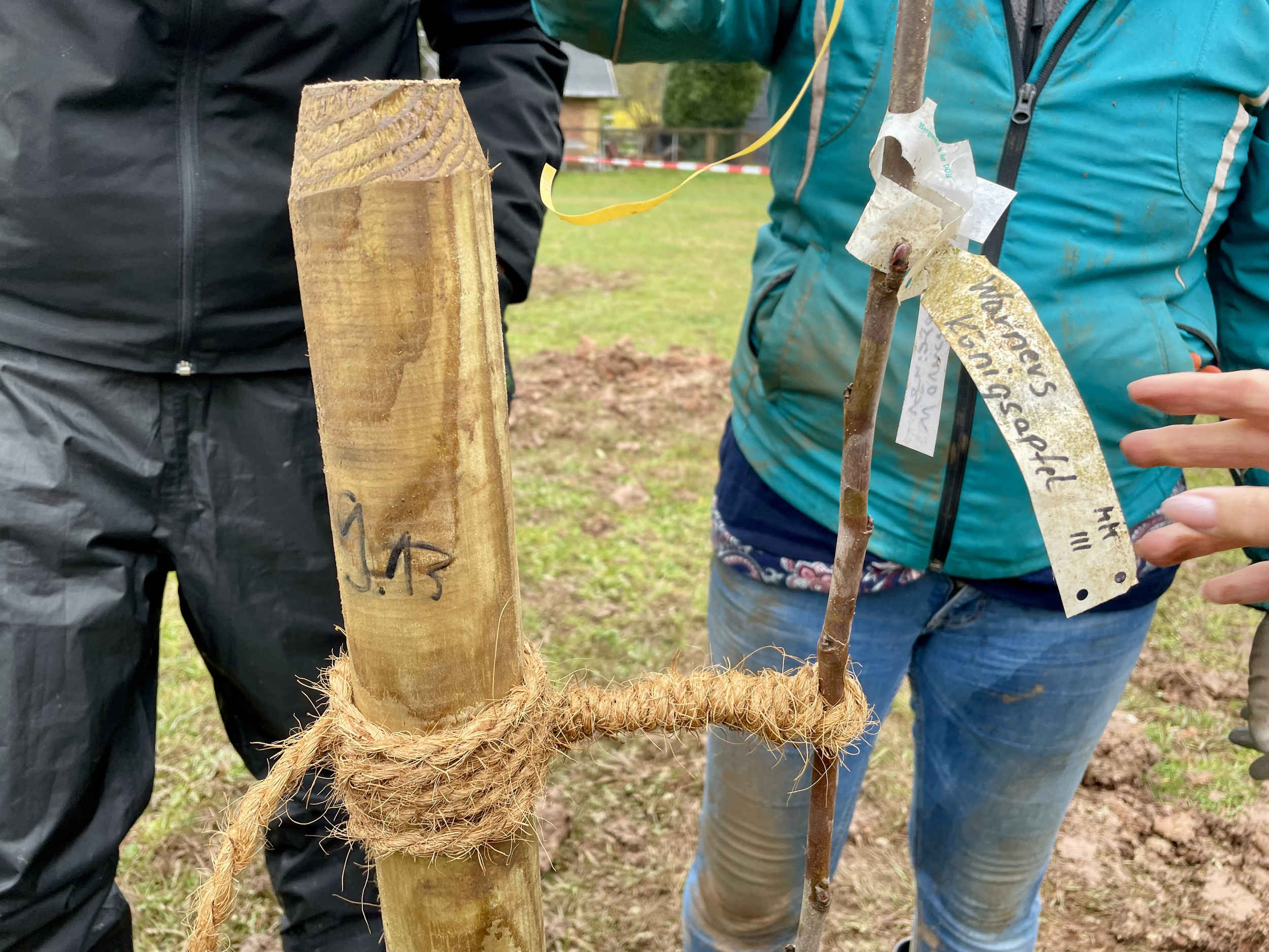 Ich ging mit meinem Bäumchen zu einem der vorab ausgehobenen noch freien Pflanzlöcher. Zuerst den Wühlmauskorb mit etwas Substrat hinein, dann das Bäumchen, den Wühlmauskorb etwas zusammendrücken, sodass die Wurzel geschützt ist. Als nächstes das Pflanzloch mit Substrat und Erde verfüllen. Jetzt wird der Baum am bereits voreingeschlagenen Pfahl mittels einer bestimmten Knotentechnik, welche ich leider nicht in Worte fassen kann, mit etwas Abstand fixiert. Fertig. Ein paar Volunteers waren mit dem sogenannten Vulkankrater beschäftigt, der letzte Schritt. Es handelt sich dabei um einen kleinen Erdwall rings um den Stamm. Alle verbliebenen Volunteers packten Zelte, Bänke und Schaufeln noch ins Transportfahrzeug und so ging ein sehr regnerischer Einsatz zu Ende.