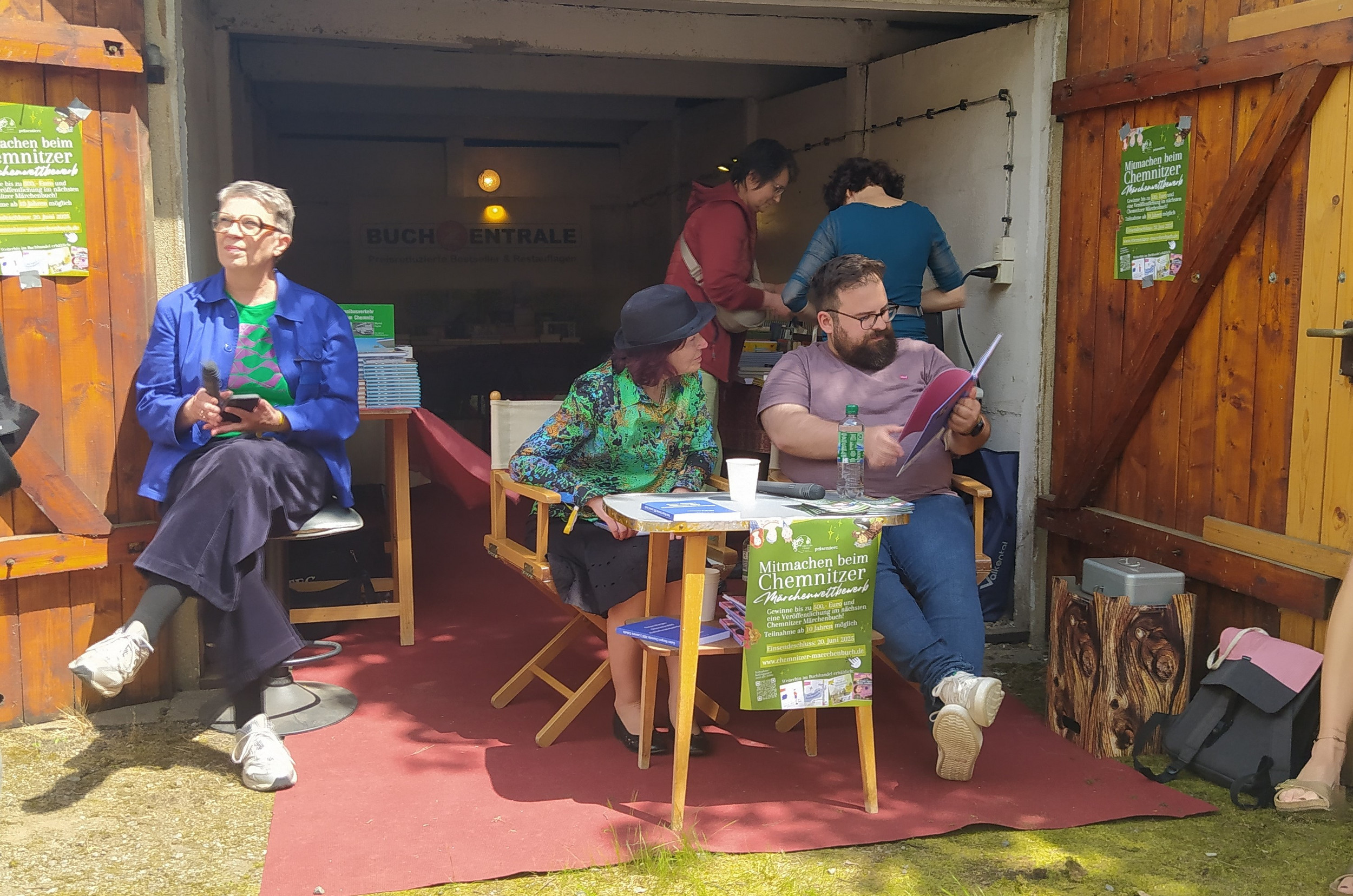 Die Garagenzeile hinter der großen Bühne war zu einer kleinen Erlebnismeile geworden. Vor der „Literaturgarage“ nahmen große und kleine Besucher Platz, um Garagengeschichten der Autorin Leonore Cebulla zu hören. Marcus Lehmann las sein preisgekröntes Chemnitzmärchen. Ort der Handlung? Natürlich eine Garage! „Kikaninchen“ vom Fernsehen gab sich die Ehre, MDR Kultur war vertreten, Mitarbeiter der Sparda-Bank, einer der vielen Sponsoren der Kulturhauptstadt, standen für Gespräche mit Gästen zur Verfügung.
