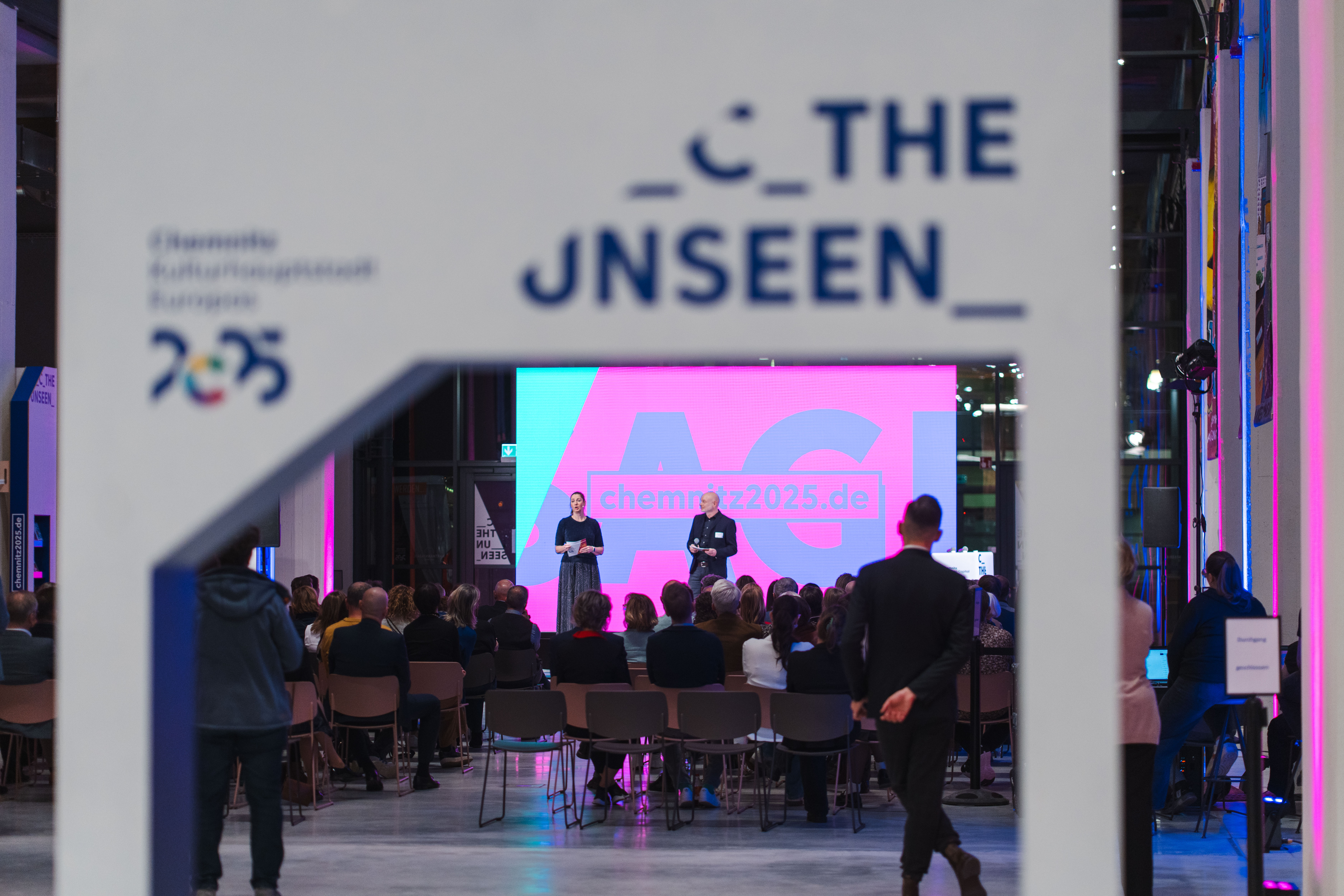 At the event "C THE UNSEEN - WE SAY THANK YOU!" on 6 November 2025 in the Hartmannfabrik, Chemnitz 2025 gGmbH expressed its sincere thanks to all supporters and sponsors. The evening was complemented by speeches, moderated discussion rounds and artistic programme items. Together, they looked back on what has been achieved so far - on the strong network that has been created and the diverse contributions that have made the European Capital of Culture project possible. At the same time, the evening was an opportunity to look ahead and show how this commitment can be built on.
