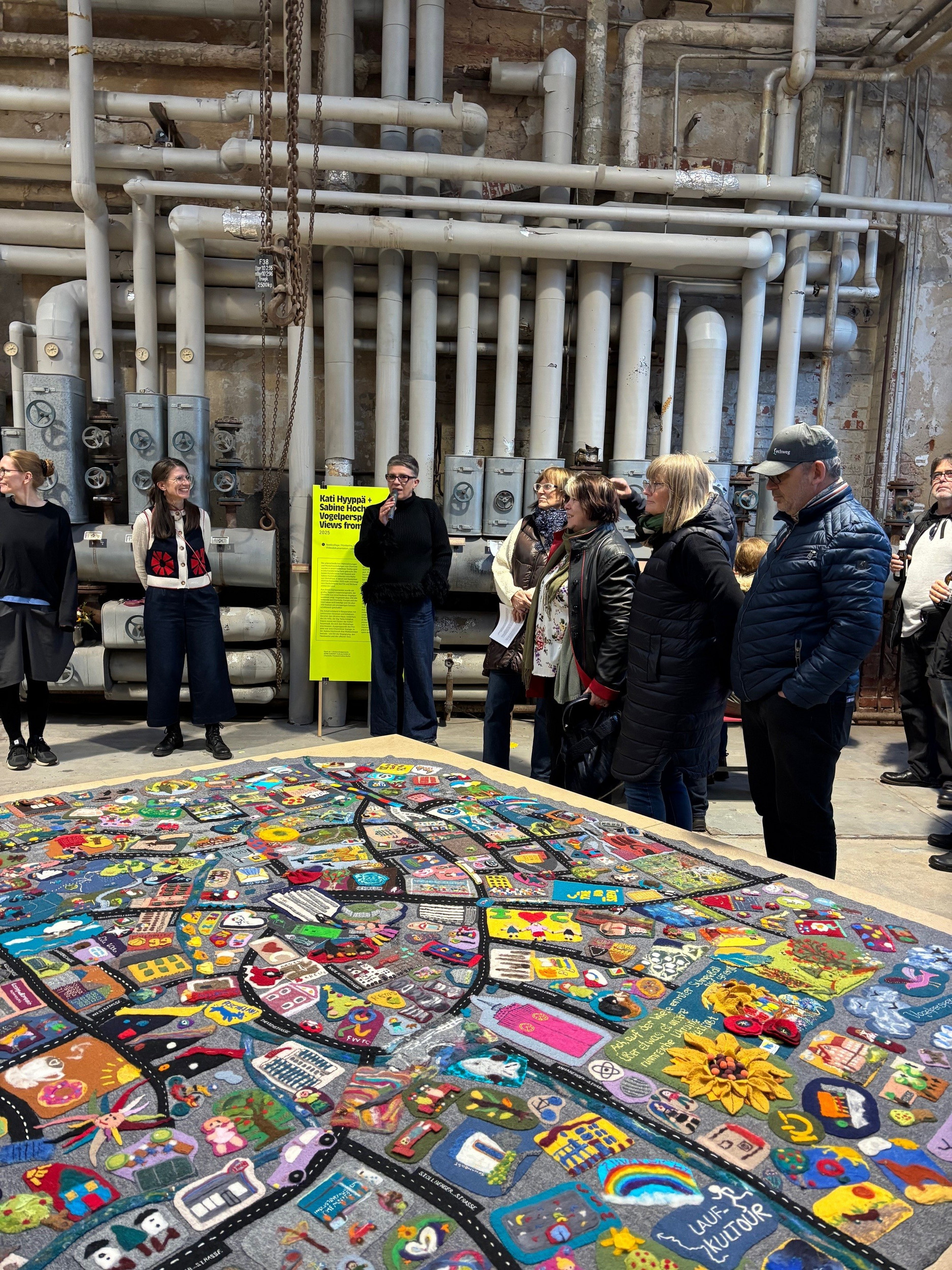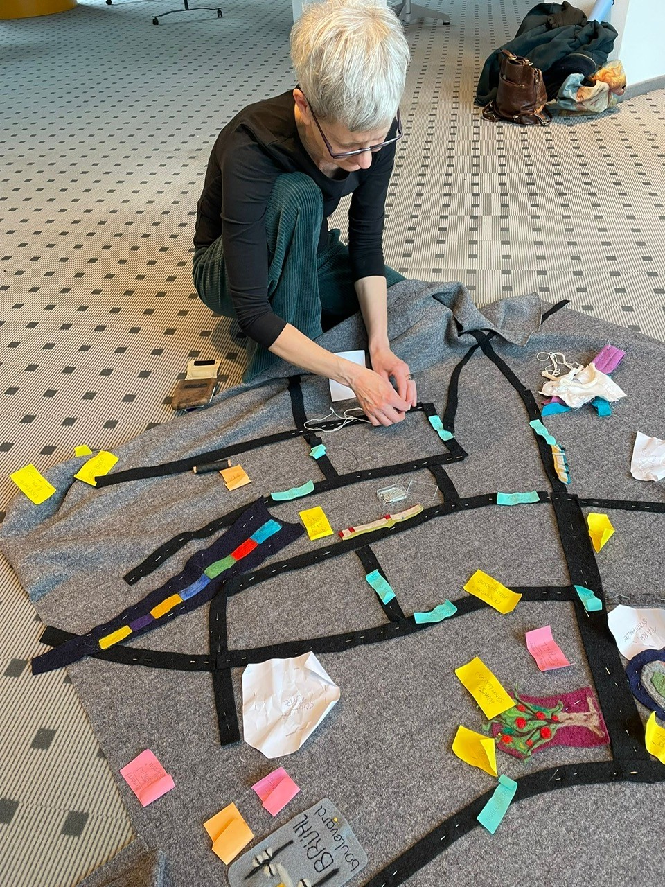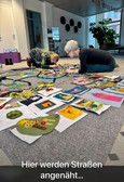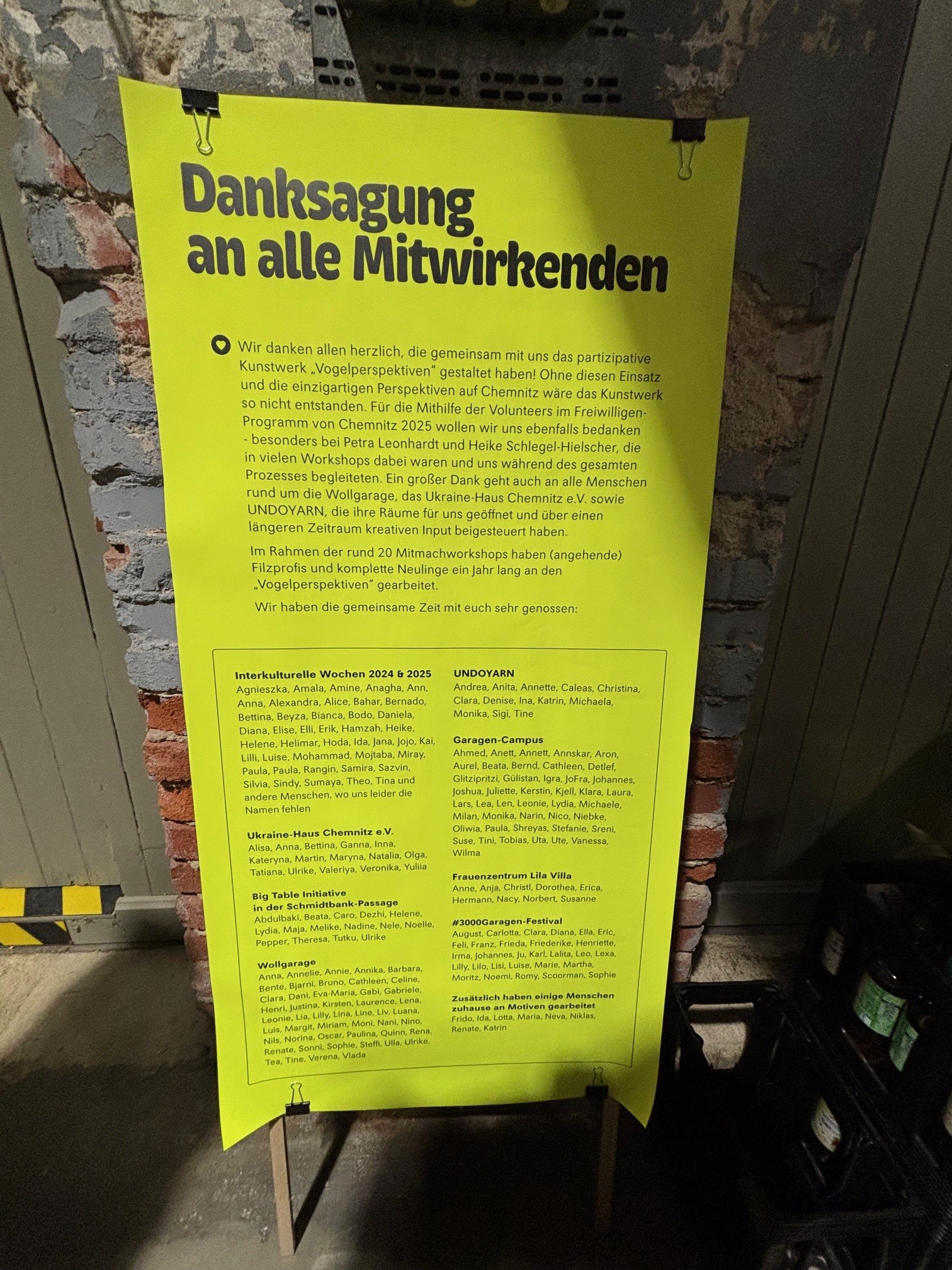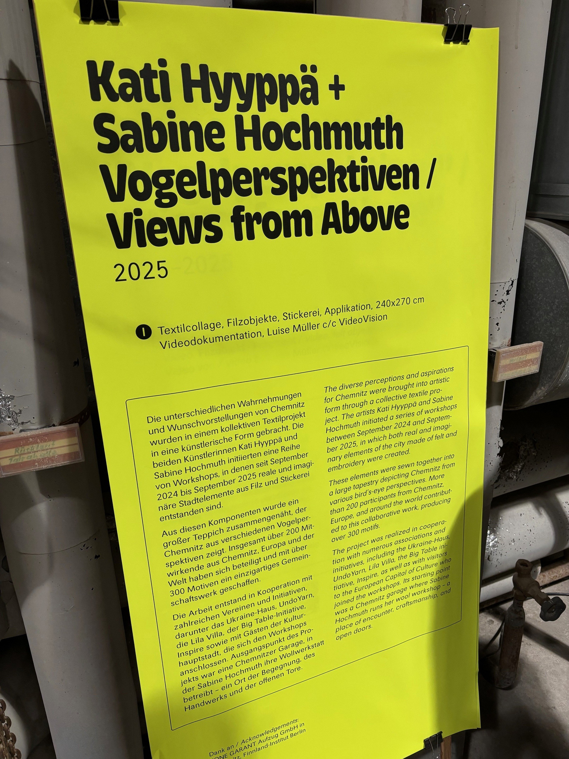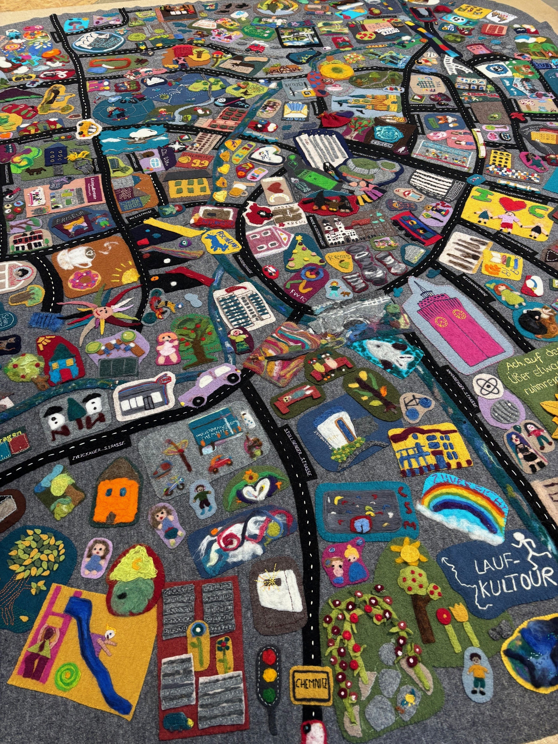 What a wonderful project! Over a year ago - in September 2024 - the Capital of Culture volunteer programme was looking for people interested in the "Bird's Eye View" project. It said that anyone who enjoyed knitting, crocheting or embroidering - in other words, working with wool - and could imagine working on the project over a longer period of time was welcome to come to the Wollgarage on Bornaer Straße for an introductory meeting. Due to the bad weather, the first meeting did not take place in the Wollgarage, but in Sabine's workshop rooms, also known as the Wollbiene. The idea was to create a wool carpet with favourite Chemnitz motifs. The idea was to create a city map as a hidden object. The working method was dry felting. I had never done it before, but it soon turned out to be easy to learn and wonderfully meditative. The results were very beautiful - as you will see here. It's great that so many people took part - people of almost all ages. The resulting variety of motifs is simply marvellous. I discovered new motifs of Chemnitz myself. For example, I had never heard of a donkey bridge in Chemnitz - but it exists. And it wasn't just Chemnitz residents who came. Some people from other parts of Germany also came to Chemnitz specifically because of this project - which was presented in the ZDF magazine programme "Aspekte" (even Swiss television reported on it). It was a great experience. So thank you dear Sabine for converting your garage into a wool garage, for your idea of the wool carpet and your commitment over this long period of time and in so many different places and thank you dear Kati Hyypiä for your artistic support, advice and personal commitment here in Chemnitz. Dear Heike Schlegel-Hielscher, nice to have met you. It was great fun. "