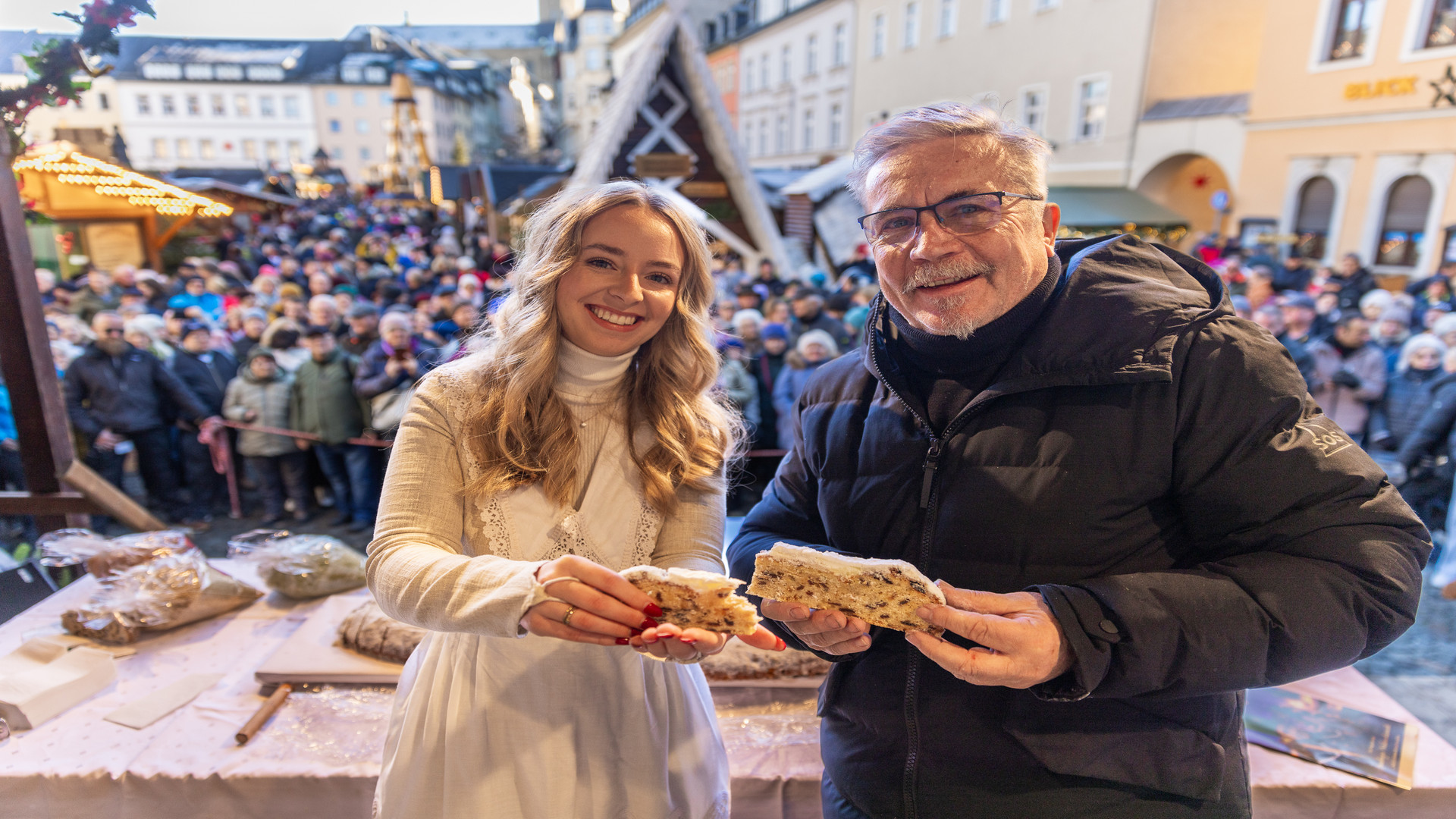 Traditionally, on the Sunday of the first Advent, the ten-kilogram giant stollen from the Annaberger Backwaren bakery is cut on the market stage by Lord Mayor Rolf Schmidt and this year's Stollen Girl Martha Zimmermann.