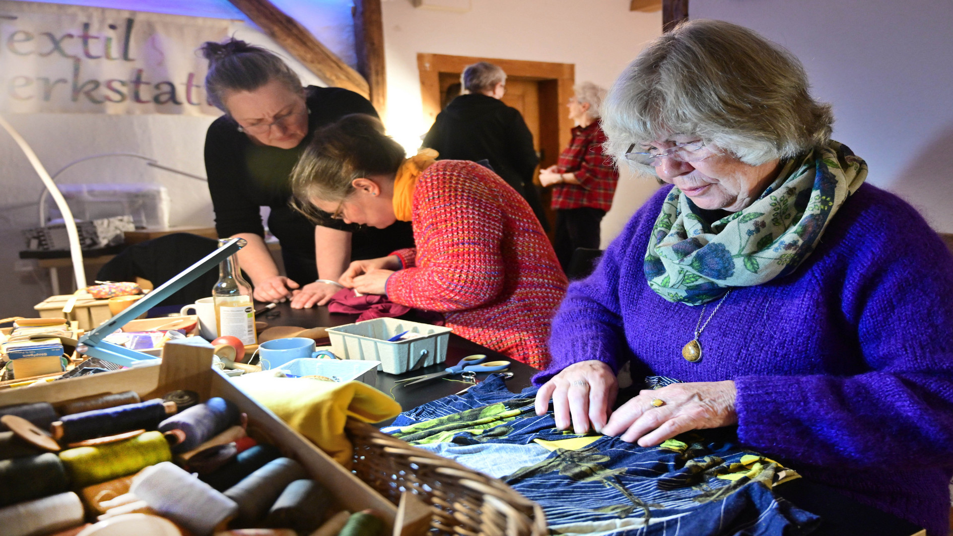 The textile workshop is fully equipped and offers an ideal environment for upgrading old textiles or realising new ideas. All participants support each other and benefit from the tips and tricks of the group and the expertise of Ina and Annika.