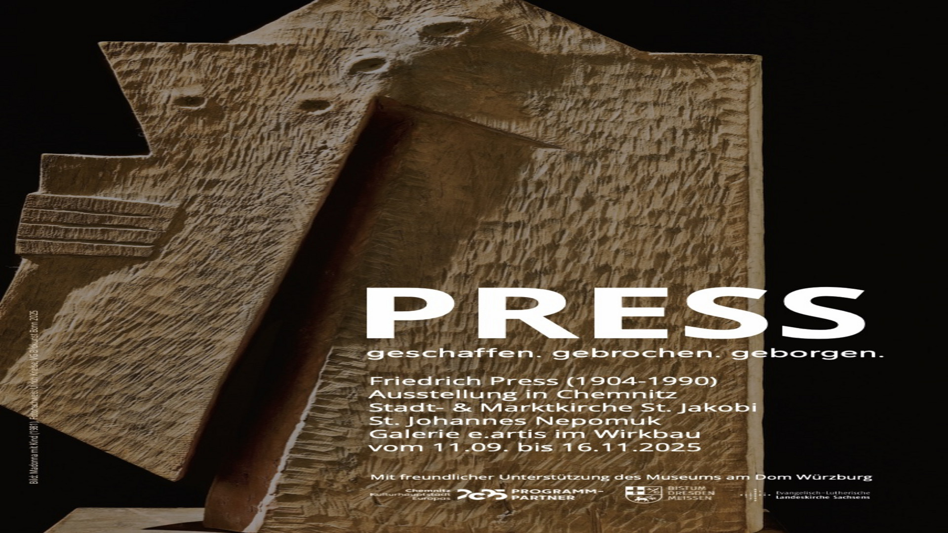 Friedrich Press, who chose to live in Dresden, is regarded as an artistic maverick with a symbolic formal language. The exhibition section in St Jakobi provides an overview of the development and diversity of his work. In St. Johannes Nepomuk, a selection of sculptures shows the artist's view of the human being between brokenness and security. Photos provide insights into his design of numerous church interiors in East Germany. Complementary works by Friedrich Press can be seen in the e.artis gallery. Prints and a catalogue will be available for purchase.