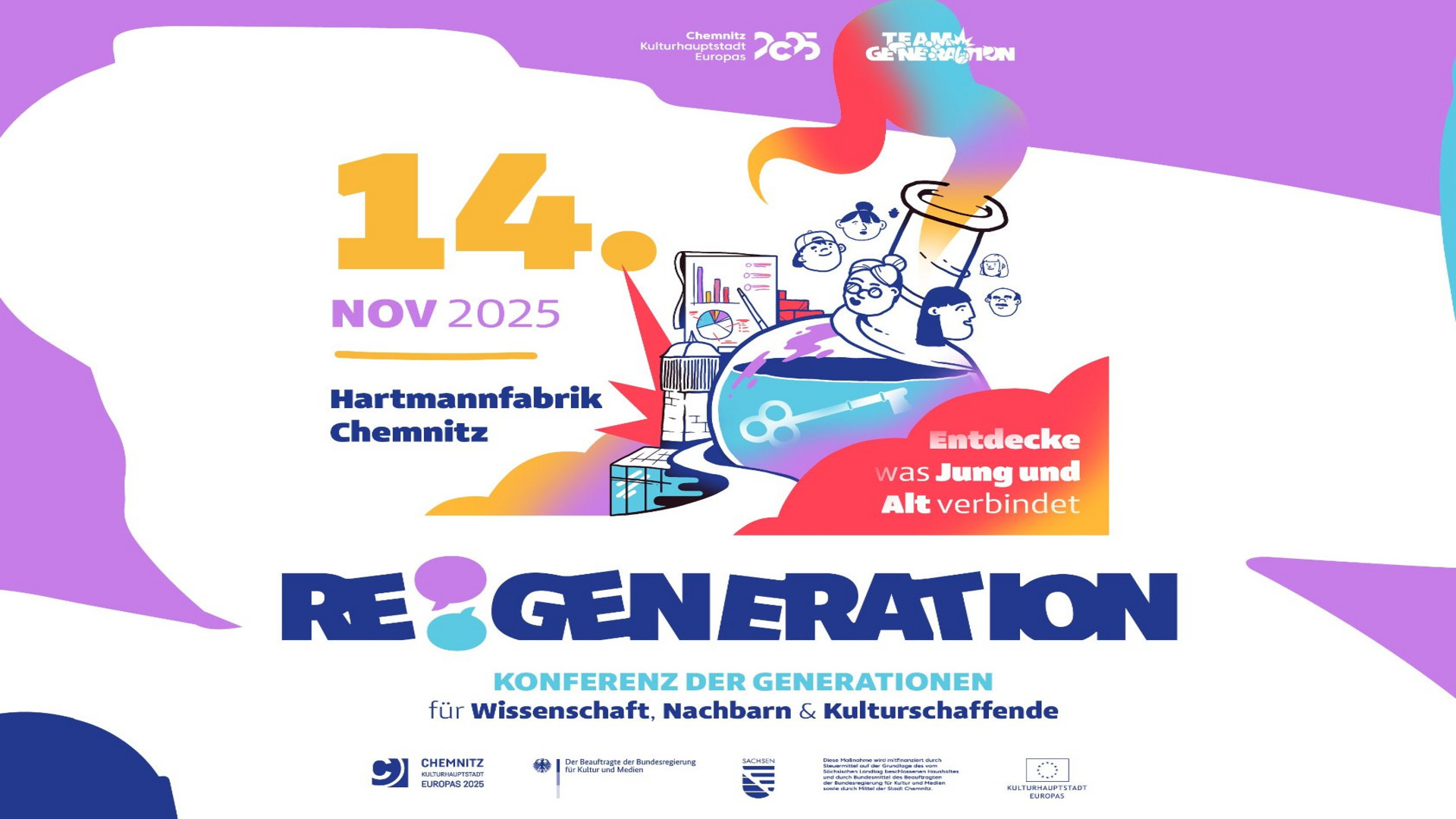 The re:generation conference is a platform on which Team Generation would like to discuss topics such as intergenerational work in art and culture as well as demographic change in a European context. As part of the European Capital of Culture Chemnitz 2025, Team Generation is entrusted with the participation of children, young people, young adults and older people and is developing a programme that takes up and combines their perspectives.