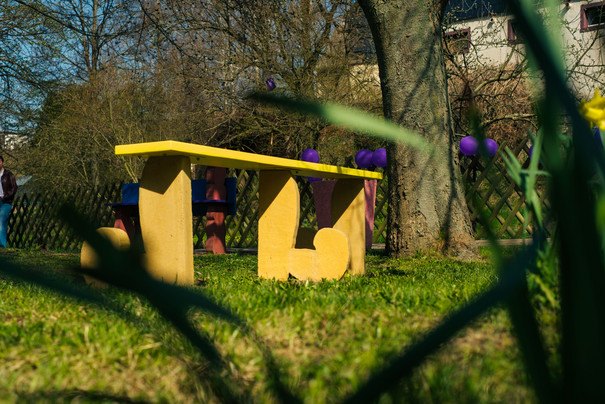 The artwork Fast legs (Marjetka), Bad mood without kiosk and kitchen (Juliana Three-Legged) by Maruša Sagadin was unveiled on 12 April 2025 as part of the opening weekend of the PURPLE PATH in Neukirchen/Erzg.
