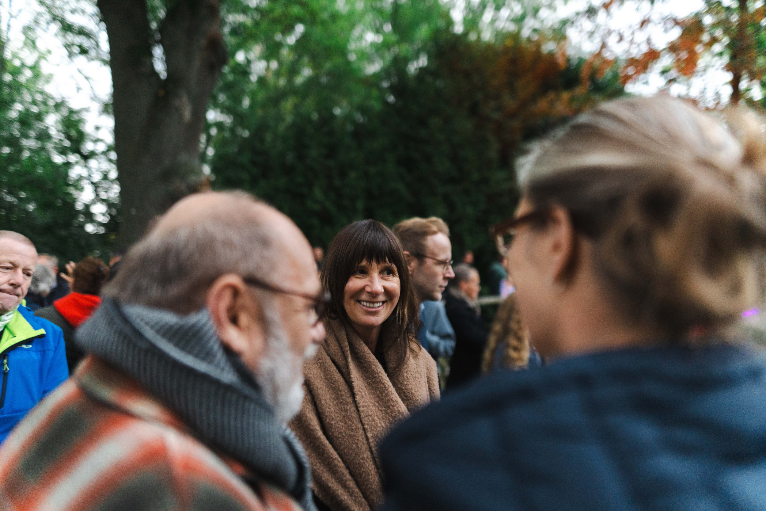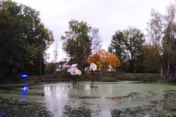 Drei zarte Gestalten schweben über dem Anlagenteich von Callenberg. Ihre Körper bestehen aus verdreht aufstrebendem, pulverbeschichtetem Armierungsstahl, die einer schnell hingeworfenen Zeichnung ähnlich aus der Oberfläche des Wassers hervorstreben und eine von unten beleuchtete, an einen Schleier erinnernde Gaze in die Höhe zu heben scheinen. Die Skulpturen „Ghosts“ (dt.: Geister) der polnischen Künstlerin Monika Sosnowska (*1972, Ryki/PL) erzeugen im Widerspruch zur Schwere des Materials einen Zustand von Flüchtigkeit. Aus der diffusen Tiefe des Teichs manifestieren sich Gedanken oder Erinnerungen zu subtilen, scheinbar tanzenden Gestalten, die zugleich Vertrautheit wie Vergänglichkeit versinnbildlichen. Sosnowskas „Ghosts“ lassen die Grenze zwischen Erfindung und Realität verschwimmen. Die aus Architektur und Fahrzeugbau entwendeten technischen Materialien wie Stahlarmierung oder mit Epoxidharz verstärkte Glasfaser werden zu fragil wirkenden Konstruktionen. Sie stellen Fragen nach dem Erbe der Moderne und ihren Versprechungen, nach Beständigkeit und ihrem Scheitern – und nach dem, was davon in unserer Gegenwart Bestand hat.