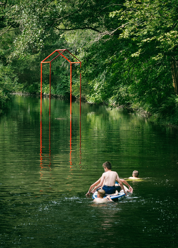 Nach etwa 3 bis 4 Kilometern erreicht man das nächste Kunstwerk: „My Floating Home“ von Karolin Schwab. Die Skulptur in Form eines roten Hausumrisses ragt aus dem Wasser des Mühlgrabens empor. Im Zusammenspiel mit dem fließenden Wasser entstehen darin ständig wechselnde Bilder und laden zur Auseinandersetzung mit der Frage des Zuhauses ein.