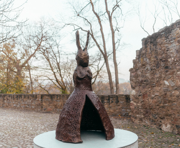 Die Tour beginnt im Hof der barocken Schlossanlage Lichtenwalde. Dort begrüßt Sie das Kunstwerk „Usagi Greeting“ von Leiko Ikemura. Die Bronzeskulptur zeigt die Figur eines Hasen und verbindet ästhetisch buddhistische und christliche Traditionen. Die besondere Form der Skulptur birgt im Inneren eine Öffnung, durch die ein Miniaturfirmament aus Licht entsteht. Die Platzierung der Figur im Schloss Lichtenwalde ist ein Bezug auf die im Schatzkammer-Museum beherbergten Sammlungen der Asiatika. Versammelt sind in der Ausstellung Kunst- und Ritualgegenstände aus Nepal, Tibet, China und Japan.