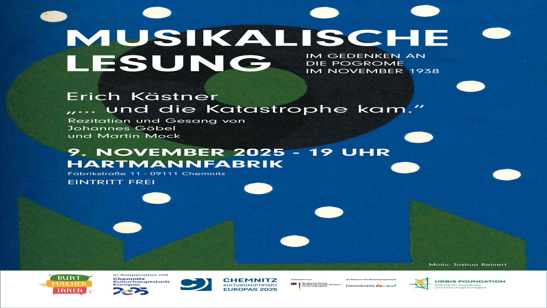 In Kooperation mit der Kulturhauptstadt Europas Chemnitz 2025. Gefördert durch den Lokalen Aktionsplan für Demokratie, Toleranz und ein weltoffenes Chemnitz, im Rahmen des Bundesprogramms "Demokratie leben!", durch den Landespräventionsrat des Freistaates Sachsen und die URBIS-Foundation (Stiftung für Demokratie und Chancengerechtigkeit).