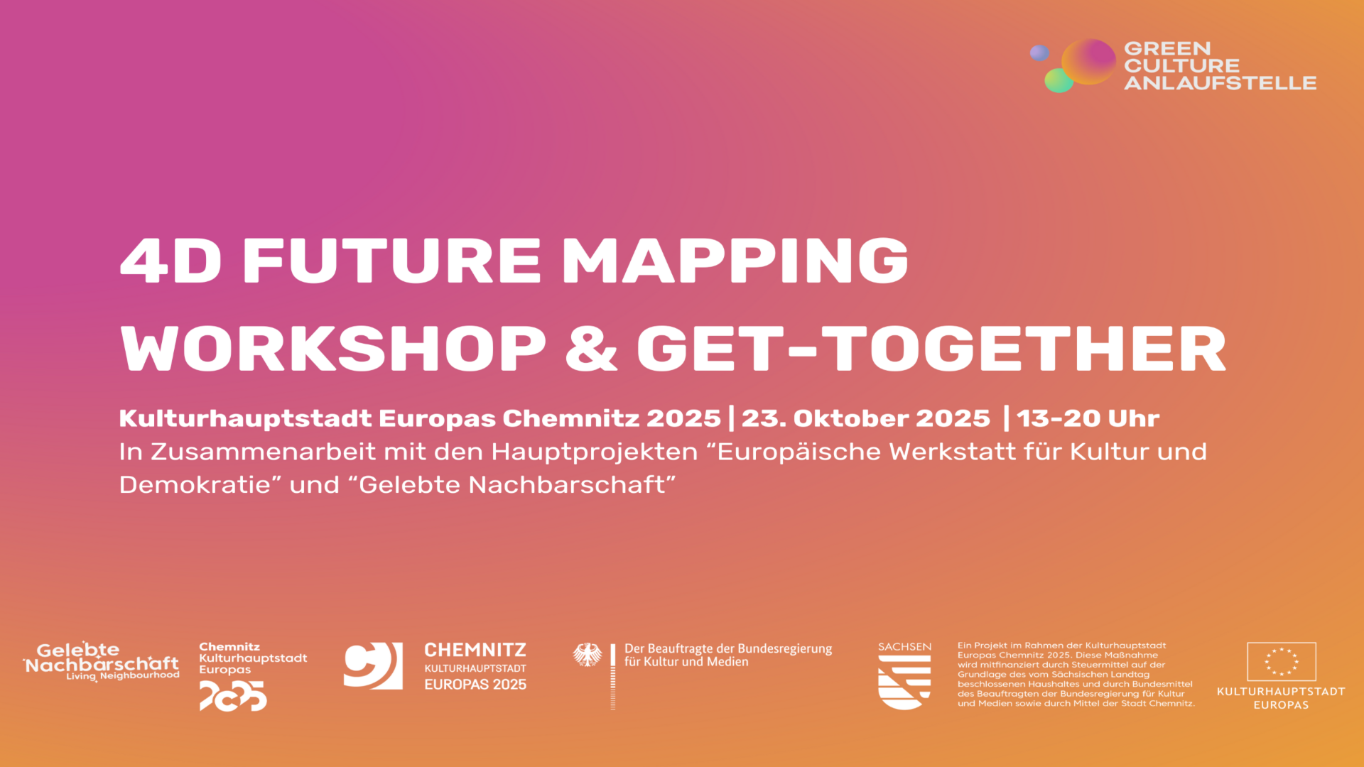 Um Anmeldung wird gebeten: www.greenculture.info/anlaufstelle and GCA in Chemnitz am 23.10.2025. Einlass ab 13 Uhr.