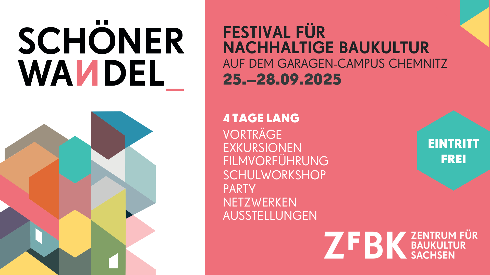 Baukultur betrifft alle Menschen. Sie umfasst neben der gestalteten Umwelt, von Gebäuden, über Grünanlagen bis hin zur Infrastruktur, auch Planungs- und Beteiligungskultur. Mit dem Festival „Schöner Wandel“ lädt das ZfBK alle an Baukultur und Nachhaltigkeit Interessierten ein, Neues zu lernen, sich zu vernetzen und gemeinsam Ideen für eine nachhaltige und zugleich schöne Gestaltung unserer Umwelt zu entwickeln. Das Programm umfasst Vorträge, Exkursionen (auch für Familien mit Kindern), eine Filmvorführung, einen Schulworkshop, eine Podiumsdiskussion und weitere vielseitige Angebote.